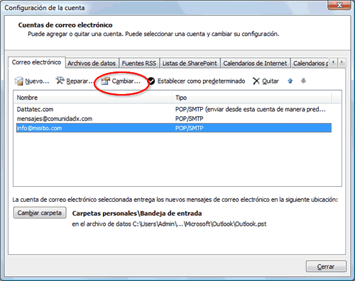 Vera en pantalla la ventana que se muestra a continuacion. Por favor, haga click sobre la cuenta que desea revisar y luego elija "Cambiar", como se muestra en la siguiente imagen: