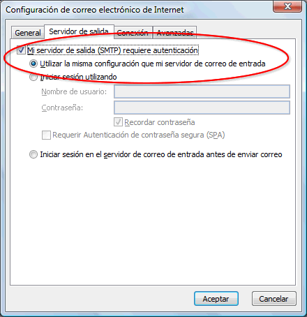 Paso 4: En la pestaña "Servidor de salida" asegurese de tener tildada la opcion "Mi servidor de salida (SMTP) requiere autenticacion". Alli, elija la opcion "Utilizar la misma configuracion que mi servidor de correo de entrada".